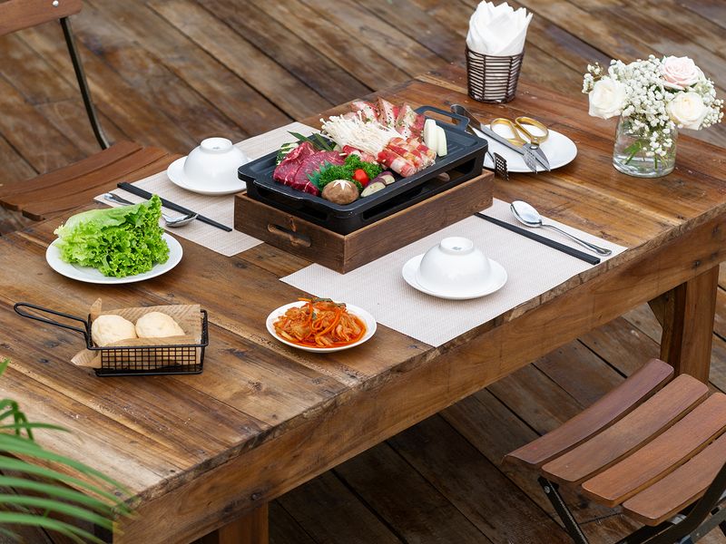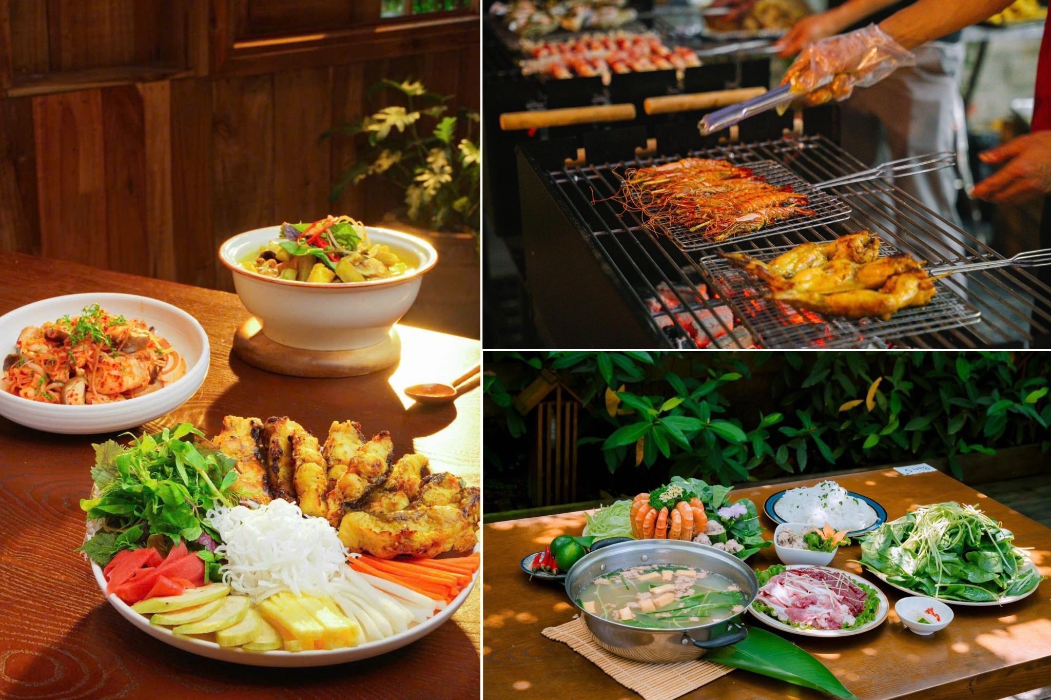 • Tại đây, thực khách được phục vụ nhiều món ăn phong phú như lẩu, nướng, cơm Việt, đồ ăn tây, kèm theo các loại cafe, trà và sinh tố hoa quả theo mùa, đảm bảo làm hài lòng mọi khẩu vị.