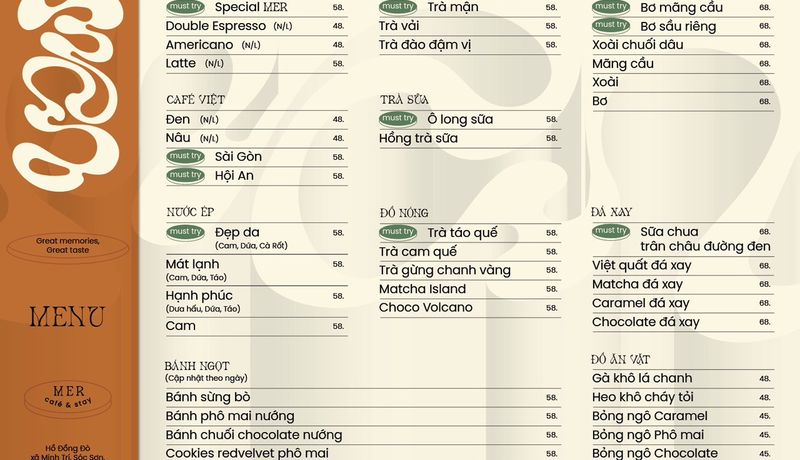 Mer Café & Stay phục vụ đa dạng các loại đồ uống như cà phê, trà, nước ép cùng các món ăn nhẹ hấp dẫn. Đặc biệt, quán cung cấp tiệc trà cho nhóm 3-4 người với giá cả hợp lý, rất thích hợp cho các buổi tụ họp bạn bè và gia đình, tạo nên những khoảnh khắc ấm cúng và đáng nhớ.