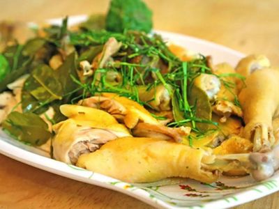 🍗 Gà hấp lá chanh: Gà chạy bộ đặc sản, giữ nguyên độ ngọt, giòn và thơm. Giá khoảng 150.000 - 200.000 VNĐ/con.