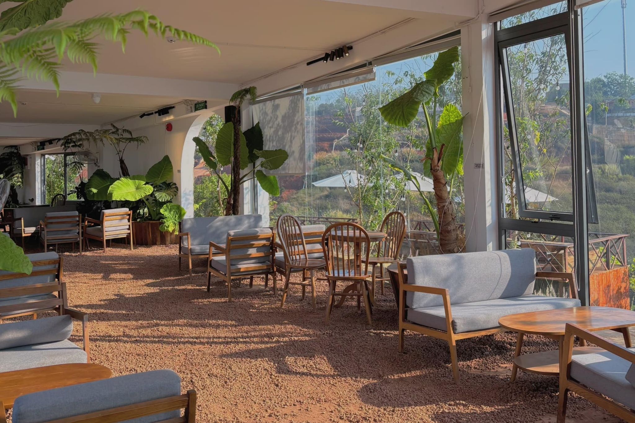 Không gian trong nhà lại mang một nét đẹp hoàn toàn khác: ấm áp, mộc mạc và đậm chất vintage. Nội thất chủ yếu bằng gỗ tự nhiên, kết hợp ánh đèn vàng dịu nhẹ tạo cảm giác thân thuộc, như được trở về nhà sau một ngày dài. Những ô cửa sổ kính lớn là điểm nhấn đặc biệt, giúp ánh sáng tự nhiên ùa vào, để bạn vừa thưởng thức ly cà phê thơm, vừa ngắm khung cảnh núi đồi xa xa. Bên trong quán, từng chi tiết decor nhỏ xinh như lọ hoa khô, chậu cây xanh, chiếc đồng hồ cổ hay bức tranh treo tường đều góp phần tạo nên một không gian nghệ thuật gần gũi và ấm cúng.