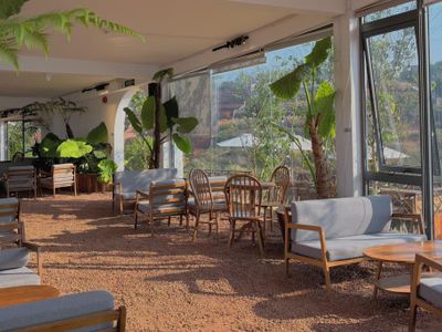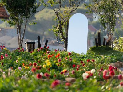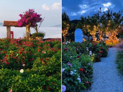 Không gian ngoài trời tại Chuyện Của Nắng tựa một bức tranh thiên nhiên đầy chất thơ. Những bộ bàn ghế gỗ nhỏ nhắn nép dưới tán cây, bao quanh là vườn hoa cúc trắng, hoa dại nhiều màu sắc và thảm cỏ xanh mướt. Vào buổi sáng, ánh nắng xuyên qua kẽ lá khiến khu vườn sáng bừng sức sống, còn buổi chiều, khung cảnh lại dịu dàng, lãng mạn như một bài hát ru. Từ khu vườn, bạn có thể phóng tầm mắt ngắm những đồi núi trập trùng, để tâm hồn thả trôi trong sự yên bình của Đà Lạt. Những chiếc xích đu dưới giàn hoa, chiếc ghế dài nơi góc vườn hay bất kỳ một góc nhỏ nào cũng đều có thể trở thành background sống ảo tuyệt vời, chỉ cần đưa máy ảnh lên là đã có ngay một bức hình nên thơ.