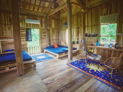 Căn được thiết kế chủ yếu từ gỗ tự nhiên, mộc mạc và ấm áp, được trang bị đầy đủ điều hòa, vệ sinh,...