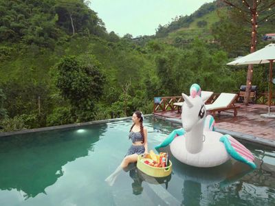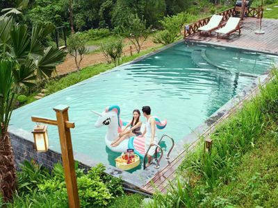 🏊🏻 Bể bơi diện tích 65m2 , khu vực người lớn sâu 1.5m , khu vực các bé sâu 80p, free phao check in siêu xinh