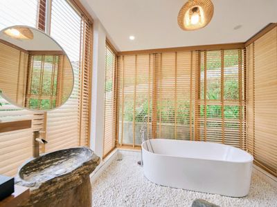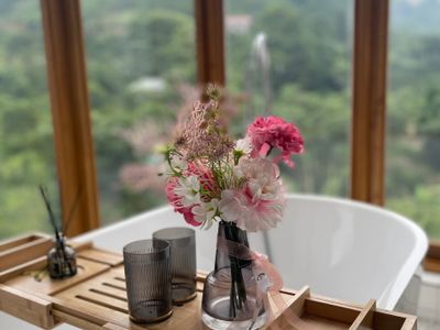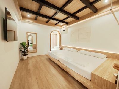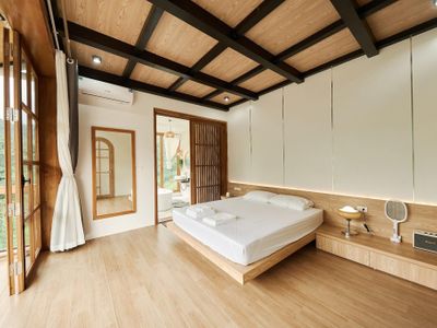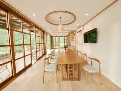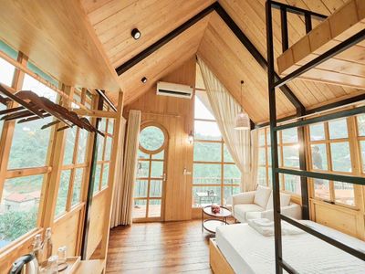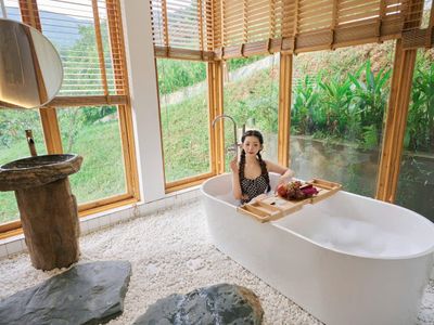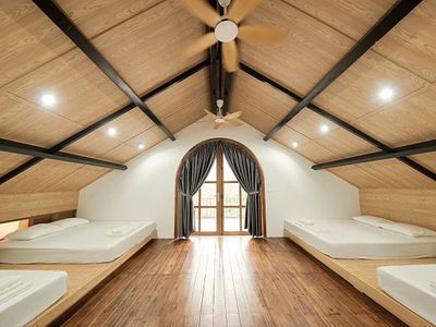 Nhà chính có 3 phòng : 1 phòng 1 giường 18x2m , 1 phòng 2 giường 1,5x2m cả 2 đều có bồn tắm siêu chill và 1 phòng tập thể 4 giường 1m8 x2m