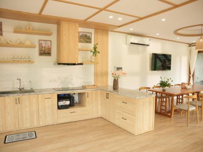 Tầng 1 là phòng bếp đầy đủ tiện ích nấu nướng , bàn ăn và có wc lưu động